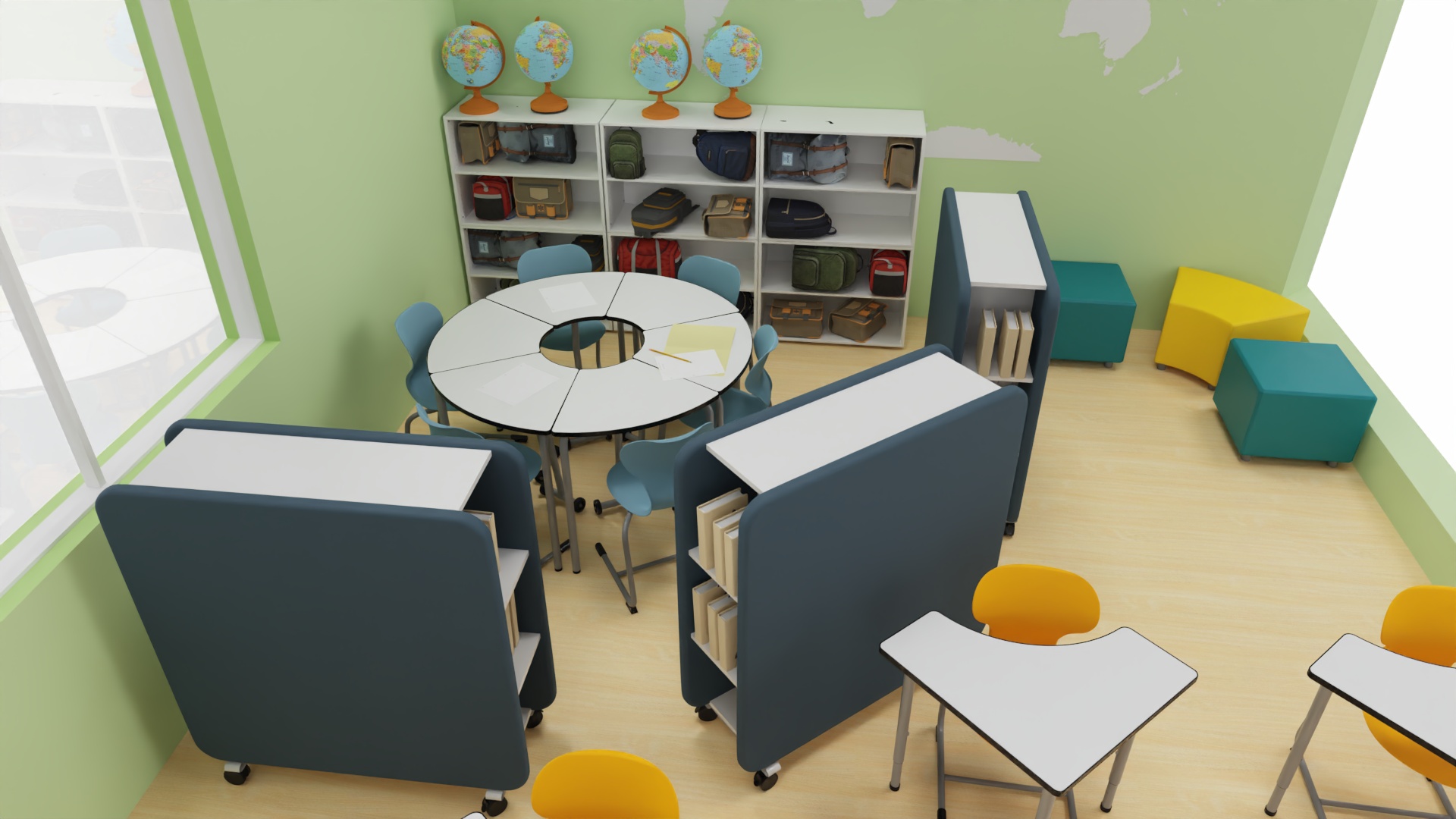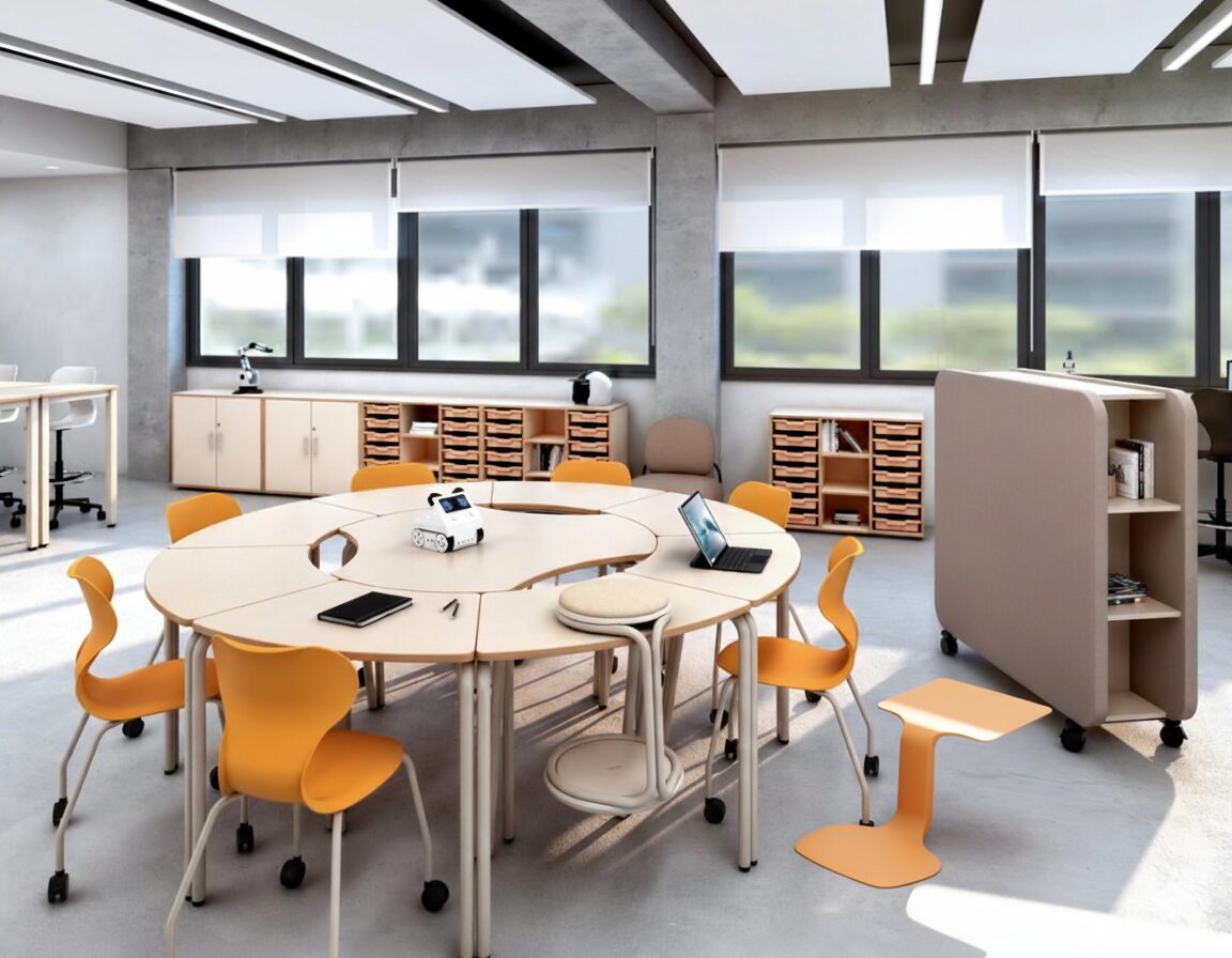 Unser Ziel ist es, die Kreativität im Klassenzimmer durch innovative Anordnung und Gestaltung der Möbel zu fördern. Ohne traditionelle Arbeitstische wachsen Fantasie und Zusammenarbeit.