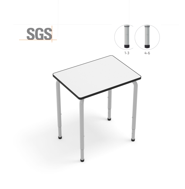 Höhenverstellbarer Schülertisch für jüngere Jahrgänge. Gestell aus Metall und Tischplatte aus MDF.