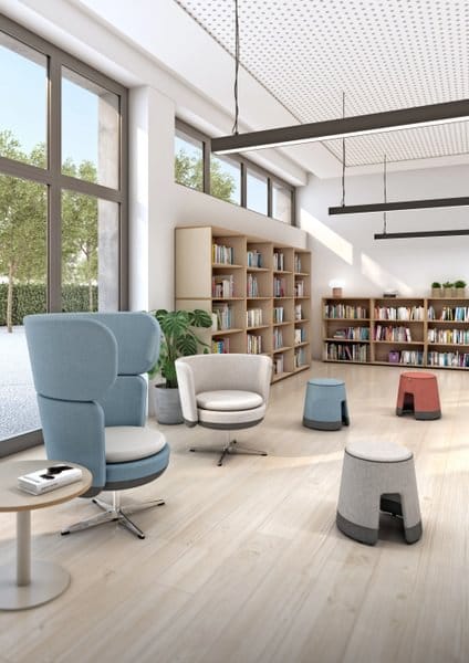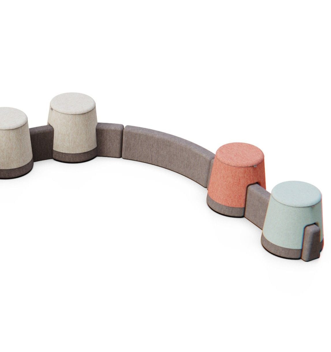 Modularer Schulhocker – einfach zusammenstellen. Entworfen zur Schaffung von Ruhe- und Begegnungszonen in Bildungseinrichtungen. Ideal für das Klassenzimmer der Zukunft, Empfangsbereiche, Universitäten oder Bibliotheken.
