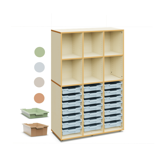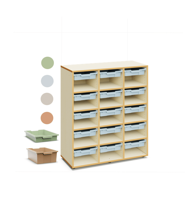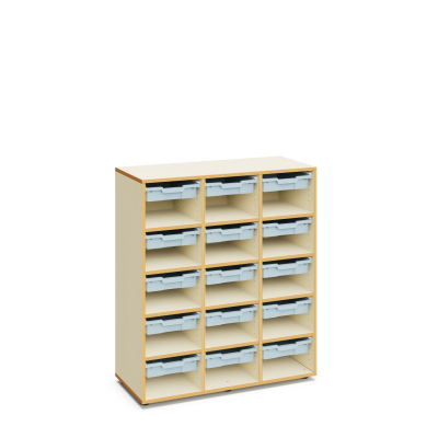 Materialcontainer aus Holz. 120 cm hoch mit 15 flachen Kunststoffboxen und freier Lagerfläche darunter. Ideal als Klassenzimmerschrank und um Material zu lagern.