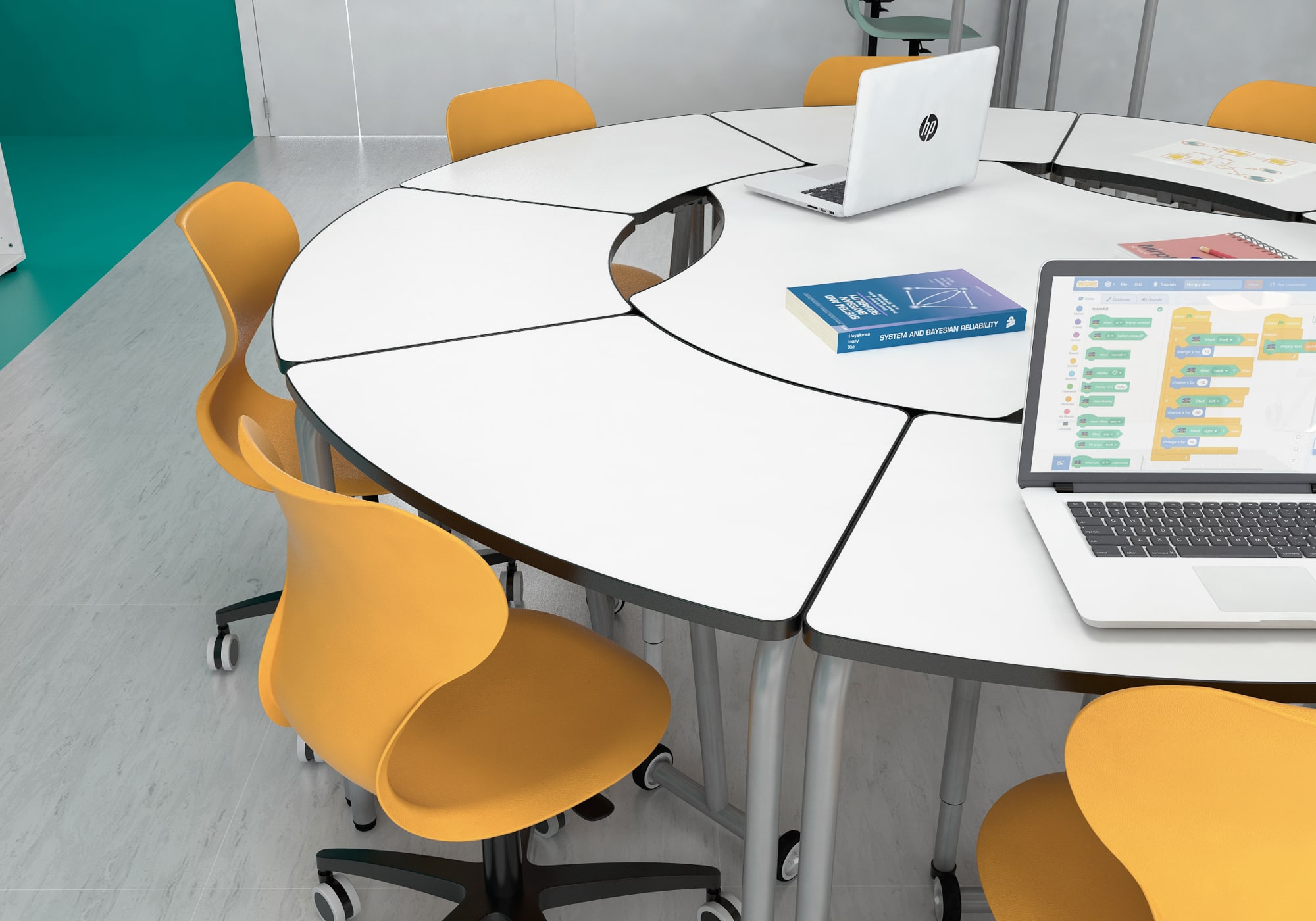 Stellt man acht Tische zusammen, entsteht ein harmonischer Kreis, perfekt für Gruppenarbeiten, Austauschrunden oder kreative Lernphasen.