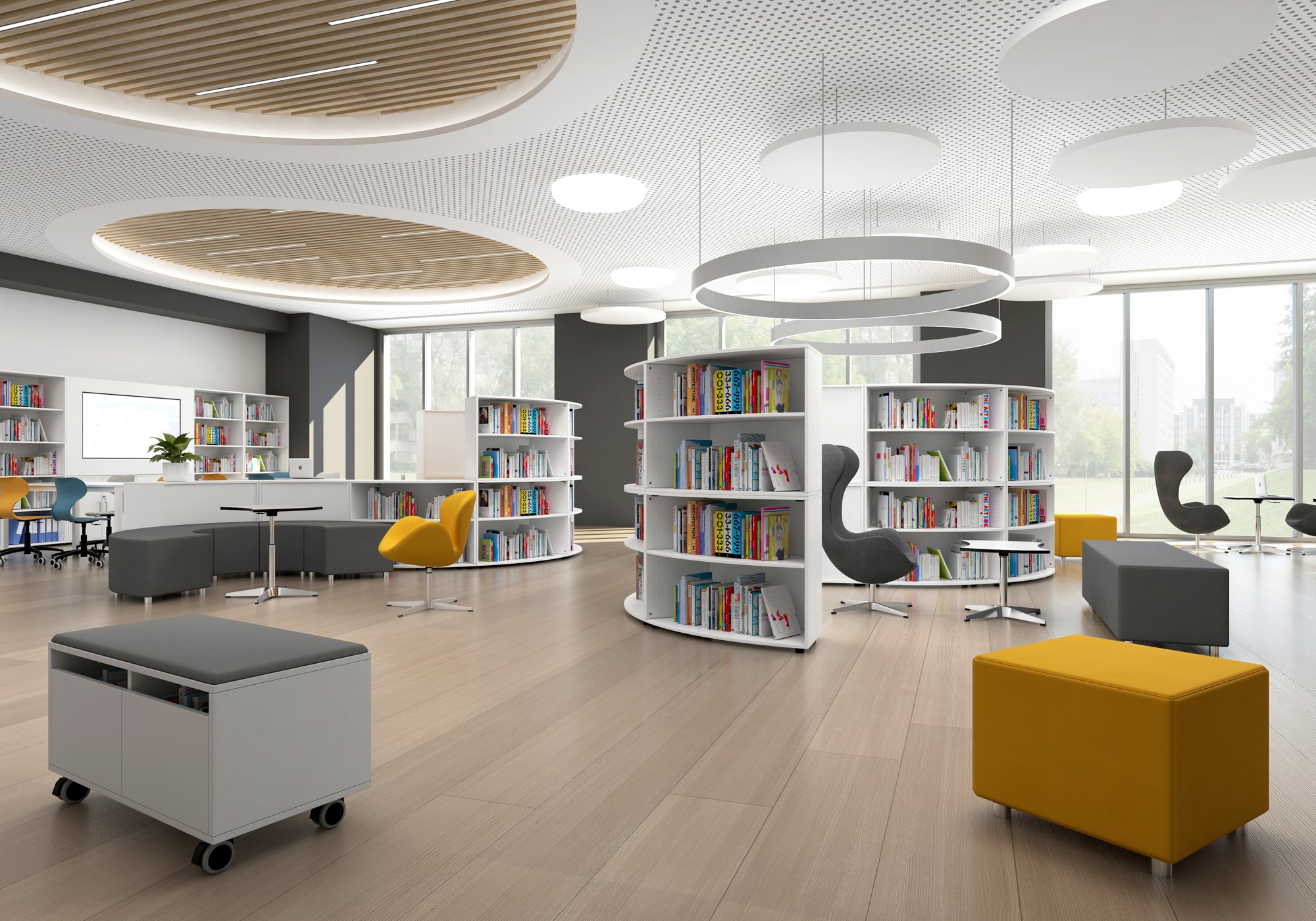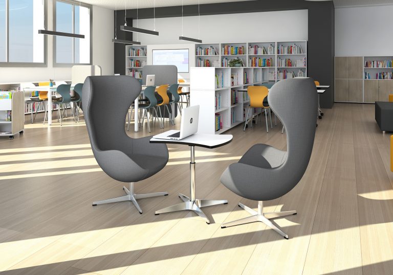 Großer Ohrensessel mit drehbarem Metallgestell. Hochdichter Schaumstoff mit Kunstlederbezug. Flammhemmend. Idealer Drehstuhl für lockere Gruppenarbeiten, Eingangsbereiche oder Schulbibliotheken.