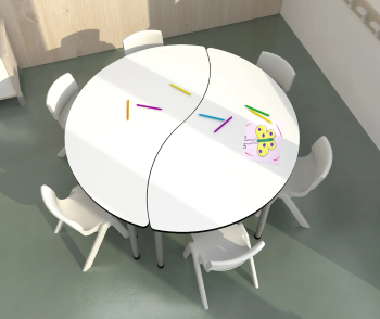 Höhenverstellbarer Halbrundtisch. Mit Metallgestell und melaminharzbeschichteter Spanplatte. Die geschwungene Form inspiriert und regt die Kreativität an. Mit einem weiteren Halbrundtisch lässt sich ein runder Tisch stellen. Lässt sich auch mit Wellentisch Yang erweitern.